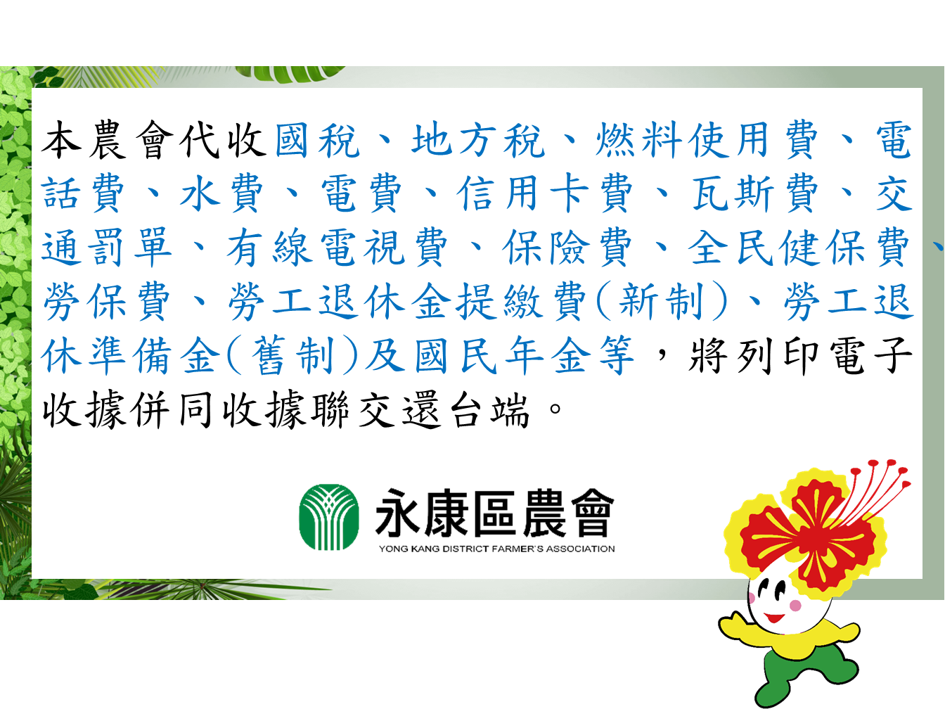 【公告】本農會代收各項費用將列印電子收據併同收據聯交還台端