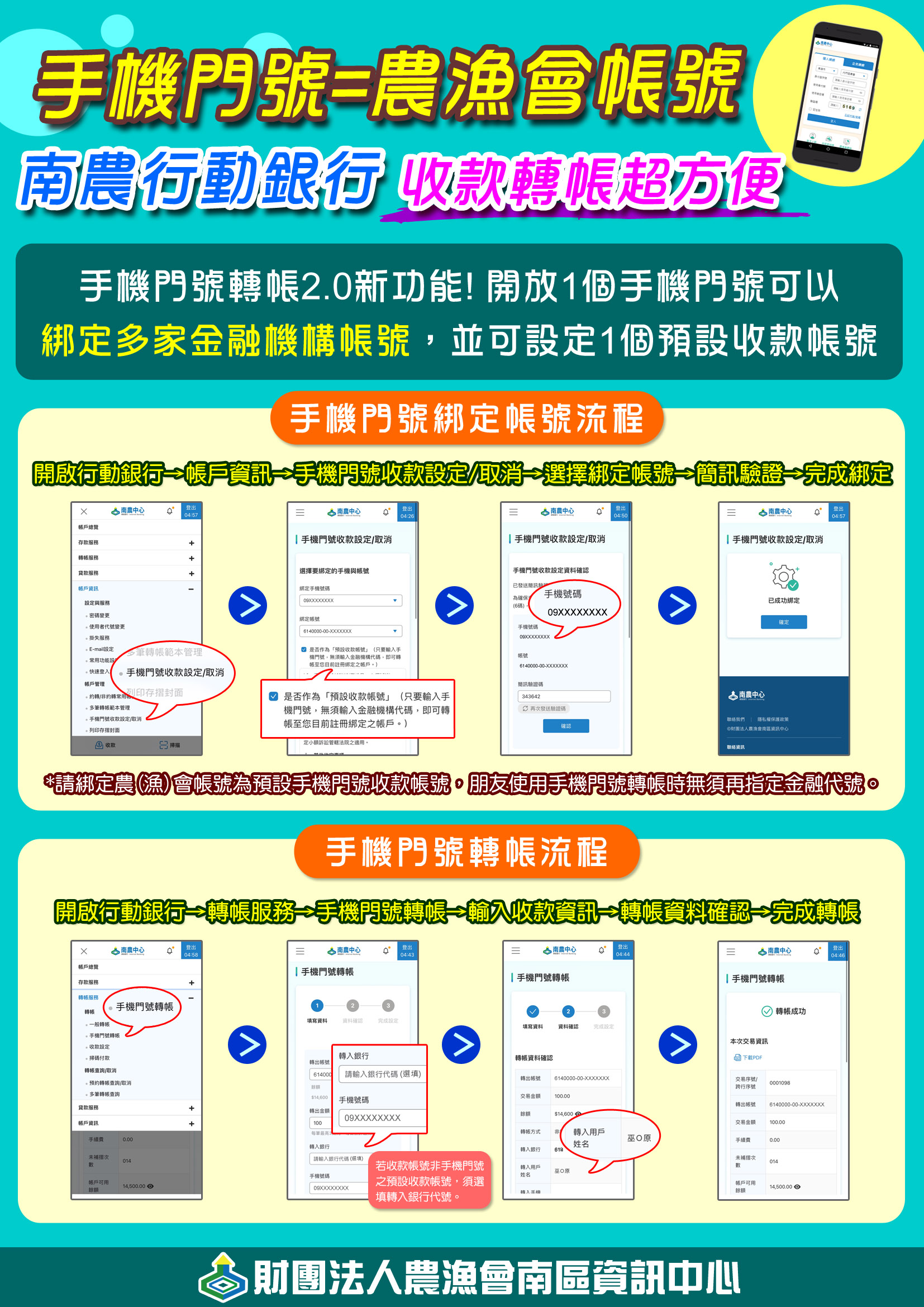 手機門號轉帳:輕鬆轉 抽好禮 活動期間:114年4月15日起至114年10月31日止 活動辦法: 1. 本會存戶於活動期間綁定財團法人農漁會南區資訊中心(簡稱南農中心)「南農行動銀行APP」之「手機門號轉帳」功能,且至活動截止日不解除綁定者,即可獲得抽獎之參加資格。 2. 用戶於活動期間以「南農行動銀行APP」或「台灣行動支付APP」進行手機門號轉帳(限轉出)次數達3筆(含)以上,即可獲得抽獎之參加資格。 3. 抽獎結果將於114年11月28日於南農中心官網(https://www.fast.org.tw)公佈,相關獎品將於114年12月發送。 活動獎品: 1. TASTy西堤牛排2人份餐券,共2組 2. Line points100點,共10組 活動限制: 1. 本活動所指手機門號僅限用戶使用本國10碼之門號,並須透過「南農行動銀行APP」或「台灣行動支付APP(須使用本會發行之金融卡)」完成手機門號轉帳。 2. 本活動期間,如參加抽獎之門號及其對應之帳戶,有解約、解綁、結清銷戶、警示戶或違反中華民國法律等情事,視同用戶放棄抽獎資格。 其他: 1. 「南農行動銀行APP」綁定手機門號轉帳及轉帳之步驟及畫面如圖所示。 2. 本活動獎品使用規則如說明。 3. 本活動之主、協辦單位有權就用戶之資格、交易成功與否等,保有審查之權利,經查核若有不符本活動之規定者,主、協辦單位得取消其抽獎資格。 4. 主、協辦單位保留對本活動最終決定及解釋權,於南農中心官網活動頁公告,無須另行通知。 5. 本活動主辦單位:財團法人農漁會南區資訊中心、南農中心會員單位;協辦單位:財金資訊股份有限公司。 說明: 一、 TASTy西堤牛排餐券使用規則: 1. 本套餐禮券可享用經典套餐之套餐乙客。 2. 本商品禮券若因季節更替調整菜單或營業型態改變,可兌換等值商品但不同價格之套餐不在此限,須補足禮券面額之差額始能兌換。 3. 全台分店不分平假日均可使用。 4. 本券已含10%服務費。 5. 本商品禮券無使用期限。 6. 恕無法與其他優惠及專案合併使用。 7. 其他未盡事宜請依照官方公告為主。 二、 Line points使用規則: 1. 請直接點選連結型POINT CODE之網址連結直接兌換LINE POINTS。 2. 必須為台灣LINE應程式使用者: (1) 尚未使用LINE應用程式者,煩請下載安裝LINE應用程式之後進行相關手續。 (2) 需使用LINE登入,並請於LINE設定電子郵件信箱與密碼。 (3) 手機門號、LINE帳號必須為本國LINE用戶。 3. POINT CODE效期及無法使用狀況: (1) 已使用過的POINT CODE無法再使用。 (2) POINT CODE具有效期限,ㄧ旦過了有效期限即無法使用。點數兌換效期為生效日後729天,而點數使用效期為最後ㄧ次獲點後的180天內。因過期失效之事宜,恕本公司不負任何責任,敬請見諒。 4. POINT CODE無法重新發放: (1) 若有遺失POINT CODE或遭盜用、竄改等情形,皆無法協助重新發放POINT CODE 。 (2) POINTS使用方法:請參考LINE POINTS支援中心https://help2.line.me/linepoints